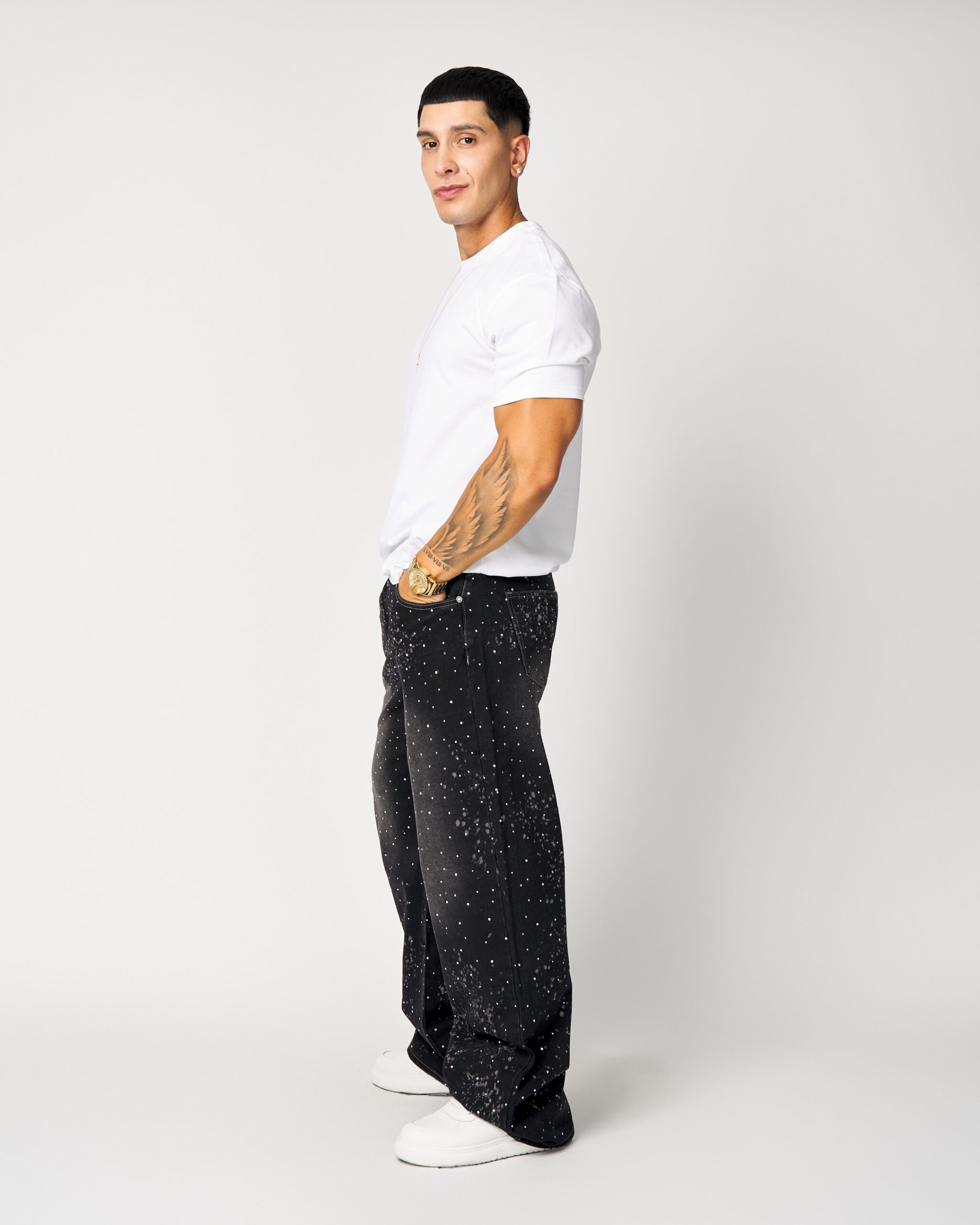 El DB512-2 es un jean wide leg en tono negro desgastado, con un diseño lleno de microaplicaciones brillantes distribuidas desde la parte superior hasta la zona baja de la pierna. Su acabado crea un efecto visual llamativo, perfecto para quienes buscan un estilo urbano con presencia.