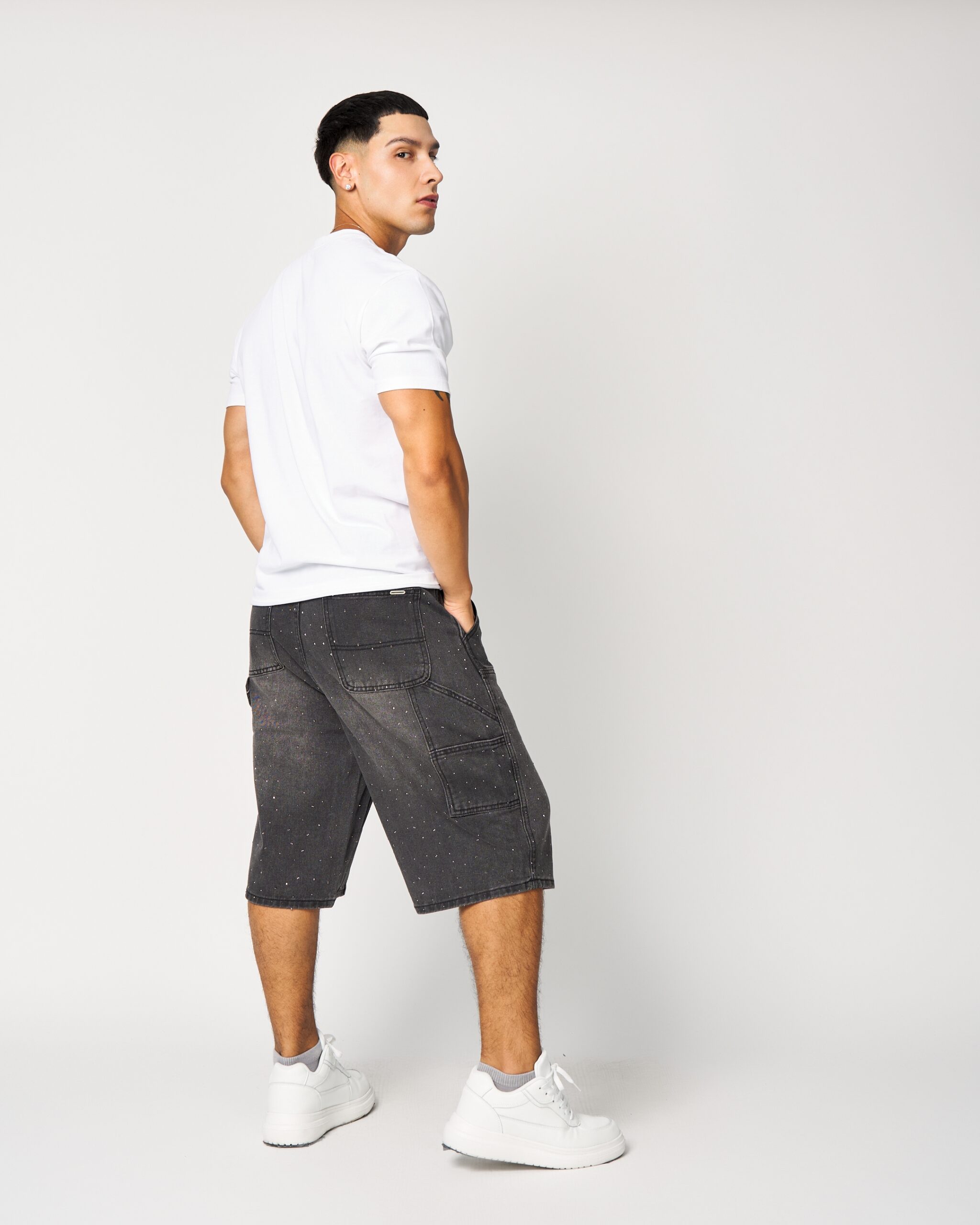 El DM052 es un short tipo cargo urbano, confeccionado en denim negro desgastado, con un calce suelto y cómodo ideal para el estilo streetwear que domina la temporada.