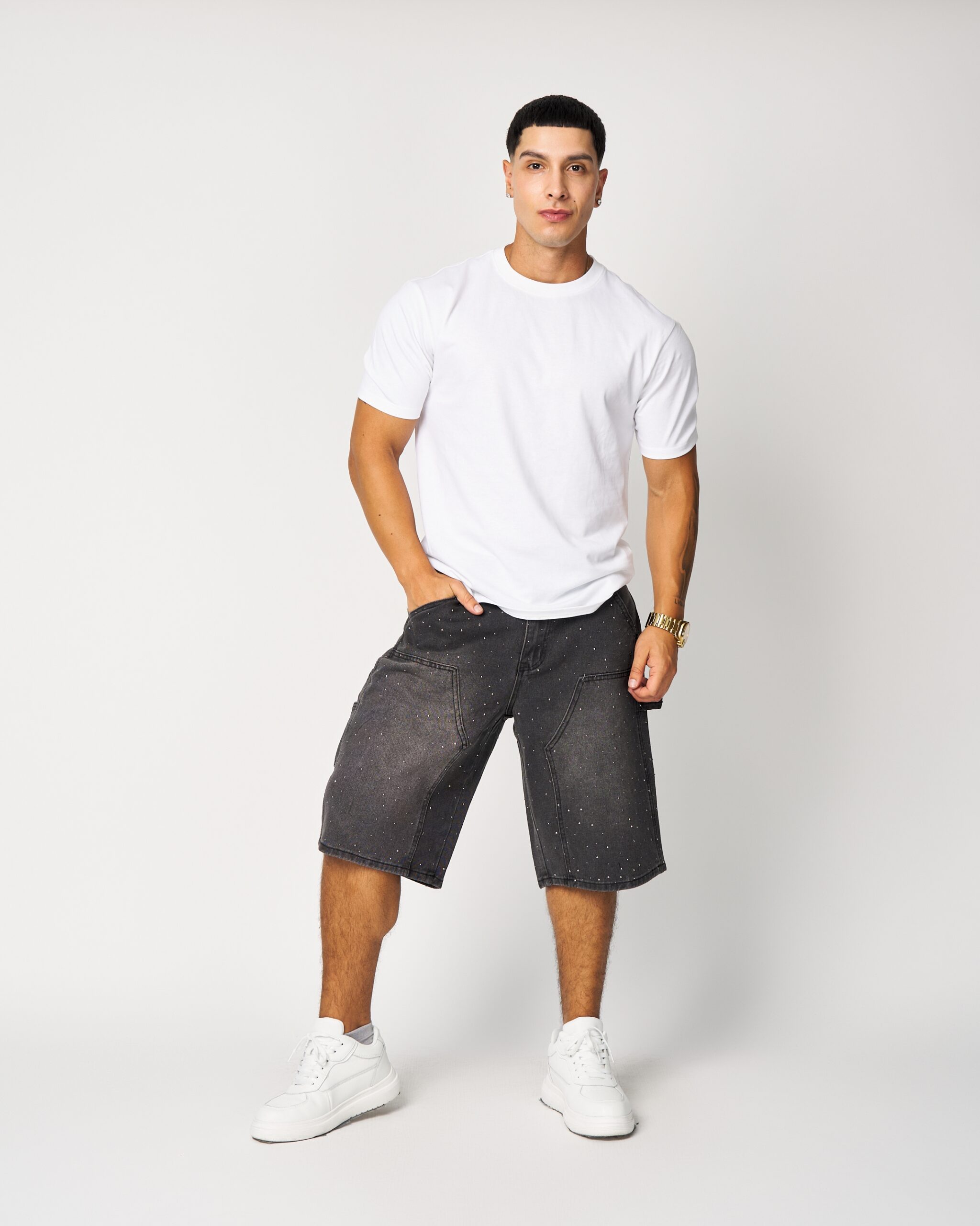 Incluye microaplicaciones brillantes distribuidas de forma sutil por todo el short, lo que le da un toque premium sin ser exagerado. También cuenta con bolsillos laterales funcionales, costuras marcadas y un largo perfecto para outfit urbano.